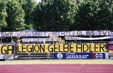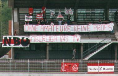 Herausgekommen ist dann eine gemeinsame Spruchbandaktion am 9. Mai 2002 (Nach der Bundesliga und vor der WM). Es sollten alle Oberligisten mit einbezogen werden und so wurden die, im Internet präsenten, Vereine (Lauda, Villingen und Denzlingen wissen deshalb wahrscheinlich bis heute nichts davon) am 9. April von mir angeschrieben. Es reagierten sogar ein paar Leute darauf und selbst verfeindete Fan-Gruppierungen sagten ihre Teilnahme an der Aktion zu. Am 29. April wurden dann die Verbände (WFV, BFV und SBFV) informiert.