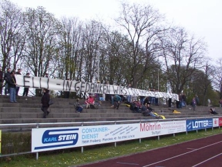 aufgetaucht, das Auto abgestellt und schon gings los. Dann gings gleich auf die Tribüne, des Banner aufhängen, kurz in der Sprecherkabine vorbeischauen und dann untern Richterturm, zur Nahrungsaufnahme. Natürlich keine feste Nahrung. Nach allerlei Gerede, auch über unseren Sonntag verstorbenen Kameraden, Michael Ellinger, ging es dann mit einem frischen Hefeweizen zur Gegengeraden.