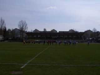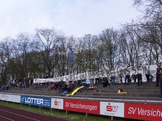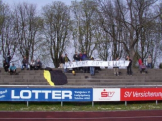 Erst als sich unser Platz langsam füllte, kam die Unterstützung etwas in Fahrt. Das Spiel war nicht toll und Chancen waren beiderseits rar. Dennoch gingen die Laudanesen in der 36. Minute in Führung. Richtig passiert ist weiter nichts und mit dem Pausenpfiff bewegte ich mich über die Bande auf die Tartanbahn, holte eine weitere Füllung für meinen Wanst und wanderte auf demselben Weg wieder zurück. Es wurde auch wieder Zeit für dr Lomb, der tatsächlich im Stadionblatt abgedruckt war. Dummerweise kamen die Spieler schon lange vor dem Liedende auf den Platz und Heikos Tapete sollte auch noch präsentiert werden. Das wurde hektisch. So kam es, daß wir den Anpfiff schweigend hinnahmen und der Abschiedsgruß für Elli auch während des Spiels zu sehen war. Bernd machte davon Bilder aus allen möglichen Perspektiven.