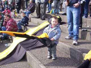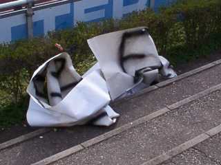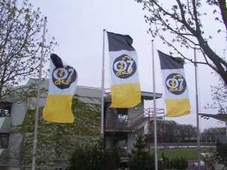 Da es ziemlich windig war, beschloß Heiko sofort sein Kind heimzubringen und wir packten Alles in sein Auto. Auch meine Kamera wurde da in Sicherheit gebracht, nachdem ich noch die, vom Winde gezeichneten, Fahnen abgelichtet hatte. Die sahen wahrlich dem Spiel angemessen aus.