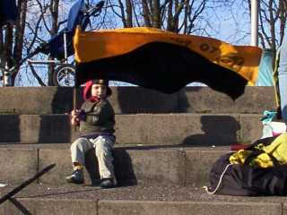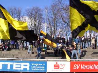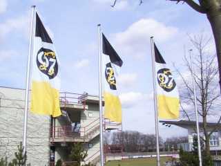 Samstag (natürlich), 8. März 2003. Der SV Bonlanden war mal wieder zu Gast im Ludwig-Jahn-Stadion. Das versprach fantechnisch recht langweilig zu werden. Um dreiviertel drei war ich endlich am Eingang und begrüßte erstmal den "blauen Klaus". Bei der Gelegenheit nutzte ich auch gleich meine Kamera um endlich die drei geilen Fahnen hinterm Richterturm abzulichten.