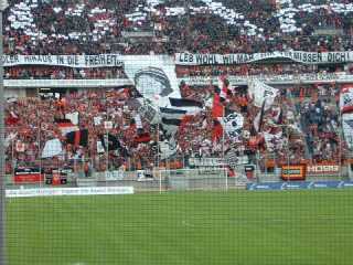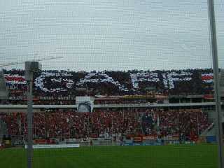 Nach dem gestigen 4:0-Erfolg meiner 07er sollte es am 25. Mai um 9 Uhr nach Frankfurt losgehen. Heiko wollte fahren und um halb neun kam auch schon der Anruf, daß wir früher starten. Konnts wohl nicht erwarten. Zum Glück war ich fast fertig und packte noch meinen Rucksack mit Bier voll. An der Aral-Tankstelle traf man sich und schon konnte die Mission Aufstieg richtig beginnen. Auf der Autobahn ging natürlich traditionell das erste Bier auf, das auch bis Heilbronn hielt. Auch Konrad war wegen der zu frühen Abfahrtszeit auch überrascht war, hatten wir etwas Aufenthalt und ich konnte mal wieder nen richtig asozialen Eindruck hinterlassen. Sonntagmorgens um neun mit ner Flasche Bier in der Hand unter nem Straßenschild lungern. Abergläubisch, wie man als Fan ist, war jeder siegesgewiß gekleidet. Konrad mal wieder im Trikot, Heiko mit dem Geburtsshirt und ich im SMG-Tour-Shirt vom Mannheim-Sieg. Tja, die Biere gingen auf und die Fahrt weiter. Bis Kraichgau, wo unser Fahrer erfolglos nach alkoholfreiem Bier fahndete. Währenddessen wollte ein bayrischer Kleinbusfahrer mir erzählen, er sei auf dem Weg nach Freiburg. Wahrscheinlich war er froh, wie wir wieder abfuhren. Beim nächsten Halt wurde unser ausgetrockneter Fahrer dann fündig, während ich eine gewaltige Rentnerherde bestaunen konnte. Was zu solch früher Stunde schon für Leute unterwegs sind. Langsam kamen wir dann auch schon nach Frankfurt. Entgegen sonstiger Gewohnheiten ging es direkt zum Gleisdreieck, ohne die Wänste mit Hühnchen vollgeschlagen zu haben. Dadurch kam ich endlich auch einmal in den Genuß einer Rindswurst bei Wachs Futterkrippe. Heilandsack, die hat nen eingebauten Nachbrenner und ich war schlicht begeistert. Dazu wurden zum Zeitvertreib noch diverse Äppler geleert und der Zechplatz unterhalten. Als wir dann zu fünft waren, ging es schon zum Stadion. Diesmal waren die Kontrollen bei den Kassenhäuschen und es war die Hölle los. So früh schon so einen Andrang habe ich noch nicht erlebt. Nachdem man sich also durch die Kontrollen gequält hatte, mußte ein Konrad wild pissen, was natürlich die Staatsmacht auf den Plan rief. Sein Timing war auch wirklich schlecht. Nachdem der Schreck folgenlos blieb, entledigte ich mich auch noch einiger Flüssigkeit, während eine ESSA-DK vor dem Eingang für 90 Euro (Leute gibts) den Besitzer wechselte. Schließlich ging es dann zum Block. Allgemein war die Stimmung prächtig und die Zuversicht zum Aufstieg groß. Der Block war eigentlich auch schon voll, wie eigentlich das ganze Stadion. Nur in der Ostkurve neben dem Gästeblock war noch der übliche freie Platz frei. Ein paar Plätze unten auf der Haupttribüne waren auch nicht besetzt und ich schätze, daß da doch ein paar Schwarzhändler auf ihren Karten sitzen geblieben sind. Der Ordnungsdienst bemühte sich redlich, die Fluchtwege zwischen den Wellenbrechern frei zu halten, was ihnen mühsam gelang. Zum Spielbeginn gab es dann die Abschiedsaktion für "GAFF", der in der Nacht zum 12. Mai 47jährig verstarb. Auf dem Oberrang war dies eine Zettelchoreographie, die ich leider natürlich nicht mitbekam.