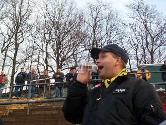 Das Spiel lief dann in eine Richtung und der Support war nicht übel. Wir sollten unsern Frank mal zu einem Trommlerlehrgang nach Idar schicken. Das Megaphon der Saarländer erboste Heiko derart, daß er diesen Kindergarten aufs übelste beschimpfte. Die Sprechchöre "In Wehen vermißt euch keine Sau" oder "Das Taschengeld hat nicht bis Wehen gereicht" resultierten daraus. Auch ich mußte mich natürlich melden und bewies, wie laut man auch ohne Megaphon sein kann. Geile Akustik übrigens im Ludwigspark. Auch mit den Ordnern wurde manch verbaler Schabernack getrieben. Die Stimmung bei uns war also ganz passabel und zur Halbzeit hätte man locker mit 2:0 führen müssen, aber, wenn man die Chancen nicht reinmacht (Winnie is überall) ... In der Halbzeitpause nutzte ich die Gelegenheit und erwarb eine Rote, die gar nicht übel schmeckte. Heiko bastelte sich aus einem Biebecher ein Megaphon und schon hätte es weitergehen können ...