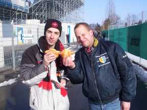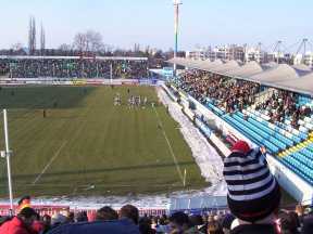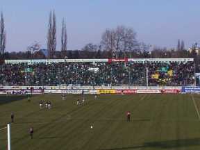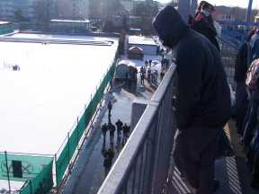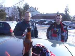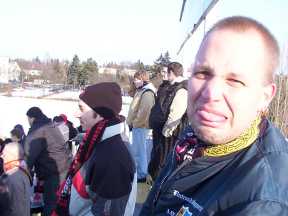 An der Eingangskontrolle kam ich mal wieder ungeschoren durch und Konrad mußte seine Handschuhe aus der Tasche ziehen. Er ist halt der Liebling der Ordner. Die Schuhe durfte er jedoch anbehalten. Die Stahlrohrkonstruktion des Gästeblocks machte schon einen imposanten Eindruck (wenn die mal wieder in die Regionalliga absteigen is die wahrscheinlich fünf Minuten nach Spielende abgebaut), obgleich das Ganze etwas provisorisch aussah. Am erstbesten Wurststand genehmigten sich meine Kameraden erstmal tolle "Knackwürste" (Brühwürste?). Ich zehrte von meinen körperlichen Reserven (hatte zum Glück gut gefrühstückt) und ersparte mir so diesen "Genuß".