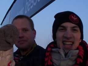 auch wir, mächtig durchgefroren aber glücklich, den Ort des Triumphes.