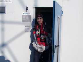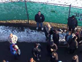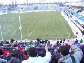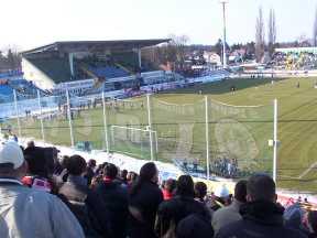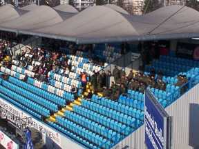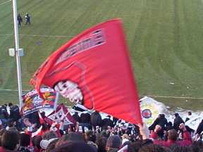 Bei der Gelegenheit fiel mir auch gleich auf, daß die Winterjacke kein Fehler war. Da oben zog es wie Hechtsuppe. Auf der anderen Seite des Spielfelds standen uns also die Fans des Gastgebers gegenüber.