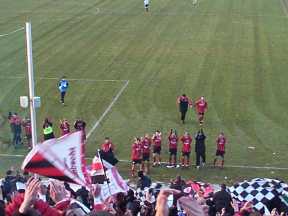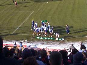 Während die Spieler sich aufwärmten sprangen auch einige leichtbekleidete Mädchen unten herum Dazwischen waren auch ein paar Buben und ich mußte wieder an das Flutlicht denken (grins). Was "Cheerleader" beim Fußball zu suchen haben, werd ich wohl nie verstehen. Dazu hätten sie mit ihren grün-weißen Tampons (oder wie die "Püschel" heißen) auch zu Ditzingen gepaßt. Dazu heißt das Grüppchen dort auch noch "Karstadt-Quelle-Versicherung-Cheers".