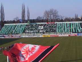 In der zweiten Halbzeit war die Eintracht dann etwas stärker, mehr Chancen hatten aber die Gastgeber. Glück und ein Nikolov verhinderten aber einen Rückstand. Stimmung war auf unserer Seite zeitweilig etwas wenig. Vielleicht viel deshalb ein kleiner Fastglatzkopf auf der Gegentribüne auf, der sich mächtig über die Unfähigkeit seiner Kleeblattkicker (soller doch ins Kleeblattheim) aufregte und sich dabei gebärdete wie seinerzeit das HB-Männchen. Jedenfalls hatte der plötzlich die Aufmerksamkeit des gesamten Gästeblocks und die Stimmung war sogleich besser.