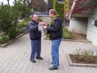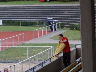 Dann ging es wieder Richtung Eingang. Dabei erfuhr ich, daß Roland auch nicht weiß, wo die Überziehfahne abgeblieben ist. Muß man mal bei Artur oder Rucki nachforschen. Was folgte war die allgemeine Trennung und ich dachte, man würde sich im Vereinsheim zum Länderspiel wiedersehen. Das Banner wurde noch eingepackt ...