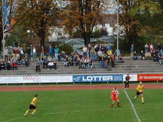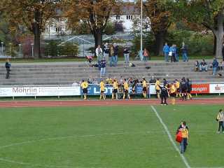 Samstag, der 11. Oktober 2003. Da ich heute frei hatte, konnte ich mal wieder ein Heimspiel besuchen. Durch den Länderspieltermin um 17 Uhr war das Spiel gegen den Bahlinger SC auf 14.30 Uhr vorverlegt worden und ich begab mich eine gute Stunde vor Spielbeginn ins Stadion. Die Schwenkfahnen beließ ich im Kofferraum, da es zu windig war und ich auch mit Regen rechnete. Natürlich waren die Masten am Eingang auch wieder nicht beflaggt, wie immer diese Saison. Hinter der Tribüne war dann von innen ein Geschrei zu hören und ich wunderte mich darüber, daß der Bahlinger Trainer seine Spieler schon vor der Niederlage zusammenschiß. Dann ging es weiter ...