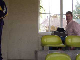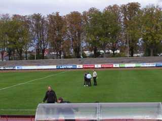 ... als zu schmal heraus, sodaß es also wieder zur Tribüne ging. Während also die Spieler sich aufwärmten und es noch eine taktische Besprechung auf dem Platz gab,