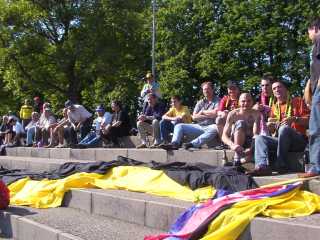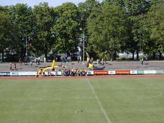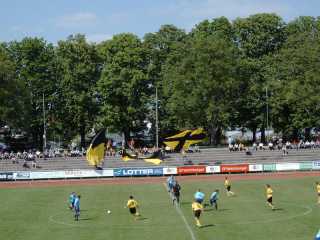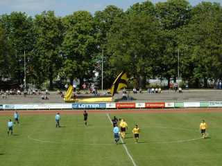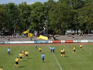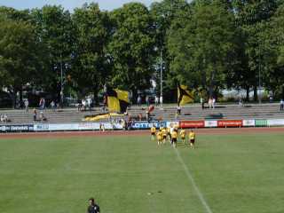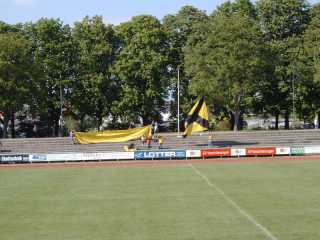 Samstag, 29. Mai 2004. Zu unserem vorletzten Saisonspiel hatte sich mit dem FV Lauda unser direkter Tabellennachbar angesagt. mit 39 Punkten standen die Laudanesen zwei Punkte und einen Platz hinter uns. Den Klassenerhalt hatten wir ja vergangene Woche schon gesichert und so ging es für uns eigentlich um nichts mehr. Der Anpfiff war auf 15.30 Uhr terminiert und da ich bis 16 Uhr bei der Arbeit eingeteilt war, hatte ich ein Problem. Um 15 Uhr wollte ich mich loseisen, was aber natürlich mißlang, weil irgendein Depp irgendeinen Scheißdreck wollte. 10 nach 3 verließ ich dann die Tiefgarage und reiste Richtung Stadion. Zügig ging es durch den Nachmittagsverkehr und um 15.20 Uhr stand meine Karre auf dem Parkplatz. Das Trikot war schnell übergezogen und dazu der Rucksack und die zwei Teleskopstangen geschnappt. Am Eingang gab es dann mal wieder einen Lichtblick. Zumindest zwei Fahnenmasten waren bestückt und die 07-Fahnen wehten im Wind. Sehr schön. Weniger schön fand ich den Anblick des Berliner Platzes. Der war mal wieder mit häßlichen Ständen bestückt und von häßlichen Menschen bevölkert. Flohmarkt halt. Schnellen Schrittes ging es dann ohne weiter Verzögerungen an die Mittellinie, wo schon ein Häuflein 07 wartete und auch die Überziehfahne wieder auslag. Sehr schön. Also die Stangen ausgezogen und Hilfe bekommend waren wir tatsächlich zum Anpfiff pünktlich bereit. Vorher unterhielt ich mich mit nem Unbekannten, schätze aber, daß das ein Gast war. Als die Mannschaften einliefen, lief es dann bei uns endlich mal so ab, wie ich mir das vorstelle.