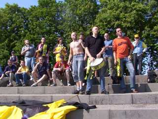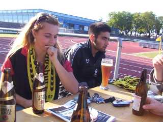 ...bis auch wir aufbrachen. Zuvor erfuhren wir noch von einigen Einbrüchen in letzter Zeit. Das kommt wohl davon, daß man Hinz und Kunz importiert ohne eine anständige Lebensperspektive bieten zu können. Naja, reine Spekulation und wir machten es uns bei der Oststadtküche gemütlich. Die Gulaschsuppe war ziemlich genial und nur ein kurzer Blick auf meine deutliche hattrick-Niederlage trübte meine Stimmung etwas. Etwas Bier und ein paar extrem schmackhafte Honig-Schnäpse später machte ich mich dann auf die Socken. Am Bahnhof faßte ich eine Busfahrt ins Auge, mußte aber feststellen, daß mein Bus vor 2 Minuten abgefahren war. Also den Rest des Weges weiterhin per pedes zurückgelegt und im Bistro einen geilen Fußballtag. |