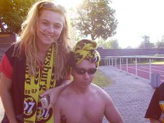 Durch die Hitze und eventuell auch den Alkohol hatte ich da leichte Probleme die Fahne in den Wind zu halten. Letztlich bekam ich es aber doch hin und der Jubel war grenzenlos. Nur zehn Minuten später trug sich Marco Fischer in die Schützenliste ein und diesmal war ich behender. Irgendwie machte es Samstag richtig Spaß 07er zu sein. Bis zur Pause tat sich dann nicht mehr viel und mit dem Halbzeitpfiff begab ich mich in den Schatten. Im Schatten war es angenehm und kurzweilig. Es wurde etwas gelabert und gepöbelt, später noch beim Lomb mitgesungen und zum Anpfiff waren wir wieder alle bereit. Obwohl sich mit zunehmender Spieldauer Lustlosigkeit in unseren Reihen breit machte,