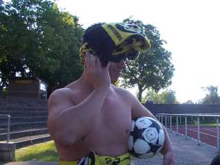 Danach erlaubte ich mir eine peinliche Aktion indem ich Tobi unterstellte, er hätte heute nicht mitgespielt. Irgendwie schaffte ich es aber doch noch mich rauszureden und es ging ans abhängen der Fahnen. Bepackt und mit einem Weizenglas bewaffnet ging es dann zu meinem Auto um die Fahnen zu verstauen. Zurück am Tresen gab es dann das übliche Gelaber und ein paar Trunkenbolde sorgten auf dem Rasen für Heiterkeit.