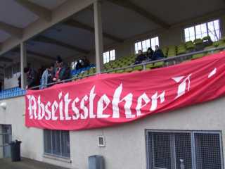 ... zogen wir wieder ab. Beim Richterturm fiel mir aber auf, daß die Fahne wieder nicht richtig hing. Beim richten mußte ich dann feststellen, daß da wohl irgendeine Mistratte von unten ordentlich dran gezogen haben mußte, denn ein Bendel war abgerissen. Sauerei. Jedenfalls band ich das Ding wieder ordentlich fest und ging dann auch wieder zurück zur Mittellinie. Diego hatte dann noch einen sehr schönen Einfall. Immerhin haben wir kein SS im Vereinsnamen. Schutzstaffelverein. Ein Brüller. Die zweite Halbzeit war dann wieder nicht gerade berauschend von uns. Chancen blieben weiter Mangelware und die Gäste spielten in ihren häßlichen grünlichen Trikots etwas besser. Der Fan-Haufen hatte sich getrennt und eine Kolonie unterm Richterturm gebildet. Dadurch kam der Hin- und Her-Singsang da drüben etwas besser, auf die Lautstärke hatte die Trennung aber eine negative Auswirkung. Auch die Häufigkeit der Gesänge nahm in der zweiten Halbzeit drüben ab. Leider kam dafür in der 78. Minute ein Aufschwung durch das 0:1 was die Reutlinger unterm Richterturm fast den Platz stürmen ließ. Irgendwie ließ der Rückstand unsere Jungs endlich aufwachen und unser Spiel wurde etwas besser. Die Stimmung war bei uns weiterhin ganz gut und wir verlegten uns aufs richtig anfeuern. Für Sinnlossupport hatte da auch keiner was übrig. Leider brachte alles nix und ungefähr fünf Minuten vor Schluß kam von Rucki der Vorschlag, schon zur Tribüne zu gehen. So machten wir zwei uns also auf den Weg die Fahne zu sichern, da wir der Polizei nicht zutrauten, das für uns zu unternehmen. Vor dem Kaffee- und Kuchenstand rief uns dann jemand aus einer Gruppe etwas zu und wollte vom Rucki wissen, ob er einer der gelben Adler sei. Daraufhin stellte ich mich vor den Fragesteller hin und wollte wissen, worum es denn ginge. Der war dann wohl etwas konfus, faselte was von nem Fascho und wollte wissen, was das vorhin auf der Tribüne sollte. Komische Frage dachte ich und meinte, wenn jemand unsere Fahne abhängen wolle, wär ich halt da. Dann wollte der wissen, ob wir uns boxen wollten und schlug ein 4 gegen 4 vor. Das fand ich dann aber zu lächerlich und wanderte weiter. Wenn sich jemand mit mir prügeln will, soll er einfach anfangen und dann sieht man ja, wies ausgeht aber auf derartiges Gelaber muß ich nicht eingehen. Die letzten zwei Minuten sahen wir dann von der Tribüne aus. Auffällig fand ich, daß von der Gegengeraden gar nichts mehr zu hören war. Ohne Rucki is dort halt gar nix los. Wär mit Rucki aber wahrscheinlich auch nicht anders gewesen, da wir eigentlich alle die Schnauze voll hatten. Mit dem letzten Eckball hätten wir dann wahrscheinlich den Ausgleich erzielt, aber bevor er ausgeführt werden konnte, pfiff der Schiedsrichter einfach ab. Damit war die letzte Niederlage in 2003 besiegelt und die Reutlinger stürmten den Platz.