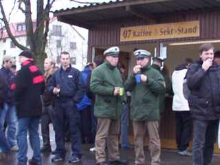 Wenigstens hatte der die 07-Zaunfahne dabei. Zwischendurch war ich aber schon erstaunt, wie die Reutlinger ihr Echo von der Eishalle zurückbekamen. Das Spiel war ziemlich ausgeglichen und nur der Assi auf unserer Seite fiel negativ durch allerlei zweifelhafte Winkereien auf. Außerdem hatten die Reutlinger die besseren Chancen und wir konnten uns mal wieder bei Robert Belosevic bedanken, daß nichts richtig Entscheidendes geschah und es so torlos in die Pause ging. In der Halbzeitpause mußte ich dann plötzlich meine Flasche abstellen und begann einen Lauf zur Tribüne. Jule sollte mir folgen, als er mir vom Bierstand entgegen kam. In der Kurve war ich aber immer noch allein und sah mich schon auf verlorenem Posten den Reutlingern gegenüber, die auf der Tribüne unser Banner durch eine eigene Zaunfahne ersetzen wollten. Wie ich ziemlich außer Atem am Ort des Geschehens ankam, waren Rucki und Jule bereits da und auch die Polizei war präsent. Irgendwie wollten da auch ein paar zivil gekleidete Gäste sich mit uns messen. Merkwürdige Leute. Als von einem die Personalien aufgenommen wurden, schallte es auch Nazi herauf. Kennt man ja, wenn man auf Streit aus ist, stellt man den Kontrahenten in die rechte Ecke und schon ist man im Recht. Als die ganze Angelegenheit bereinigt war,