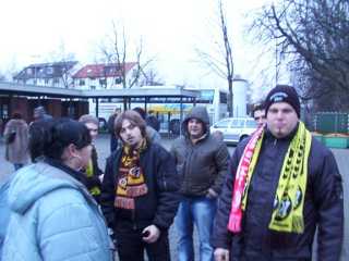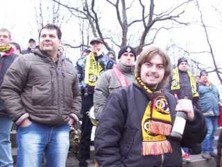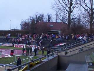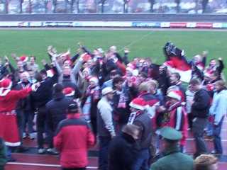 ... und man sang und trank etwas zusammen. So stell ich mir das vor. Wie dann die allgemeine Verabschiedung vorüber war, führte mich mein Weg auf nen Glühwein zum Weihnachtsmarkt und dann nach Hause. Witzig wurds dann später im Bistro, wie ein Heiko nen geilen Schal mitbrachte. So fand der Tag sogar noch ein versöhnliches Ende. Abschließend muß ich noch sagen, daß die Polizeitaktik diesmal voll aufging. Die verhielten sich unauffällig, waren aber immer da, wenn es drauf ankam. So hätt ich mir das gegen Ulm gewünscht. |