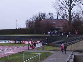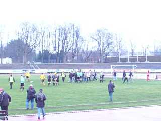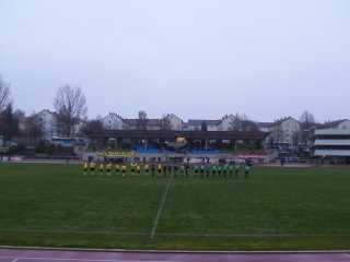 Trostlos wie das Wetter war da unsere Kulisse und es sah nach zahlenmäßiger Überlegenheit der Reutlinger aus, die hauptsächlich in der MTV-Kurve standen und für die der ehemalige 1b-Stand geöffnet war. Damit die dort blieben stand ein Stück Bauzaun in der Kurvenmitte, der so den Gästebereich begrenzte. Trotzdem standen ein paar Reutlinger Normalfans bei uns herum. Fahnenmaterial war weiter auch nichts bei uns, obwohl der Rucki mit Familie da war.