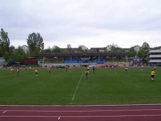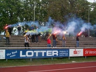 Samstag, der 1. Mai 2004. Für den Tag der Arbeit hatte sich die Zweitvertretung der TSG Hoffenheim angesagt. Zusätzlich wollten auch ein paar enttäuschte Idarer auftauchen. Die Ankunft war am Bahnhof auf 13.17 Uhr terminiert. Gegen viertel zwei parkte ich unterhalb des Bahnhofs und auch ein Jule kam angebraust. Der wollte aber warten und so machte ich mich allein zum Bahnhof auf. Die Ankunft an Gleis 1 war gleich festgestellt und recht pünktlich kam der Zug auch an. Anstatt der 5 angekündigten kamen aber nur 3 Idarer heraus. Da hätte meine Karre für den Transport auch ausgereicht. Egal, man begrüßte sich und die Ankömmlinge (Max, Diego und Benni) waren erfreut über den überraschenden Shuttle-Service. Jule transportierte dann den Benni und der Rest stieg bei mir ein. Zur Symphonie der Verstopfung von J.B.O. ging es hinter dem Julemobil her und ich freute mich diebisch, wie dieses Richtung Sackgasse (durch ne Baustelle) abbog und war erbost wie, trotz Sackgassenschild die Baustelle bereits wieder beseitigt war. Dennoch waren wir zuerst auf dem Parkplatz und man machte sich, als Jule und Benni endlich auftauchten, Richtung MTV-Maibockfest auf. Der Maibock mundete allen vorzüglich und nur der Jule nahm zusätzlich ein Weißwurstfrühstück ein. Nach dem zweiten Glas machte man sich dann gemeinsam Richtung Stadion auf. Nur ich mußte den Umweg über mein Fahrzeug machen, da dort noch wichtiges Material wartete. Am Stadioneingang wurde ich dann endlich meinen Karton mit allerlei Pyrokram los und während Jule mit den Idarern die Tribüne schmückte begab ich mich zur Gegengeraden um die Schwenkfahnen vorzubereiten. Überflüssig zu erwähnen, daß die drei Fahnenmasten am Eingang wieder nicht bestückt waren. Leichte Schwierigkeiten mit einer Teleskopstange waren rasch überwunden und rechtzeitig zu Spielbeginn wehten zwei Fahnen im Wind. Außerdem kam die Kunde vom Stadionversprecher, daß bei Pyroeinsatz eine konträre Durchsage kommen müsse. Da haben wir den wahrscheinlich ordentlich überrascht, als tatsächlich gar nichts abbrannte. Dem schlossen sich auch die beiden Mannschaften mitsamt dem Schiedsrichtergespann an. Davon, daß ein fußballerisches Feuerwerk abgebrannt wurde, konnte wahrlich keine Rede sein. Dennoch bemühte man sich auf den Rängen den Funken überspringen zu lassen. Besonders ein, ausnahmsweise mal wieder anwesender, Rucki tat sich da zu Beginn hervor. Allerdings war er nach etwa 10 Minuten wieder verschwunden. Audienz beim Bürgermeister oder sowas ähnliches hieß es. Kurios, aber auch später war die Stimmung noch ganz prächtig und der Frank tat sich ausnahmsweise positiv als Trommler hervor. Leider kann der Bursche mit Lob nicht richtig umgehen, was die Umstehenden ordentlich amüsierte. Es wurde insgesamt so ziemlich unser komplettes musikalisches Programm zum Besten gegeben und zwischendurch gab es auch mal einen Humba. Die Stimmung war also ganz in Ordnung ...