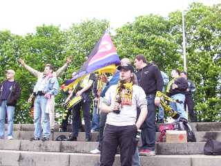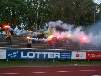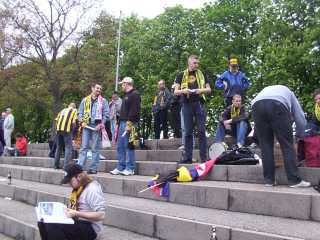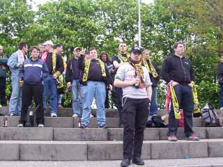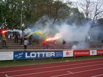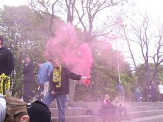 ... wenn die Leute alle unterwegs sind. Außerdem würde sich sicher die Legion-Gelbe-Adler-Zaunfahne an der Bande ganz gut machen. Und wenn ich das so sehe, bereue ich, keine Rauchfackeln bestellt zu haben. Gelber Rauch schaut gar nicht übel aus. Falls wir mal noch etwas Kohle zusammenbekommen muß davon auch was her. Nach dem Anpfiff ging dann noch kindisch ne Rauchfackel an ...