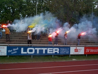 Benni war auch kräftig am auspacken und ein Frank setzte alsbald (nach der Auslosung zum 07-Freundschaftpokal bei hattrick) über die Bande um die kommenden Ereignisse für die Nachwelt festzuhalten. Bennis Materialverteilung konnte ich nicht nachvollziehen, anscheinend hatte er aber gleich ein paar Rauchfackeln verkauft. Es wurde noch dr Lomb zelebriert und es rückte der Wiederanpfiff näher. Benni gesellte sich zum Frank und wir übrigen verteilten uns und mit dem Einlauf unserer Spieler brach das Inferno los ...