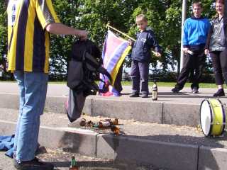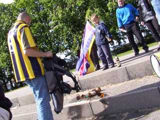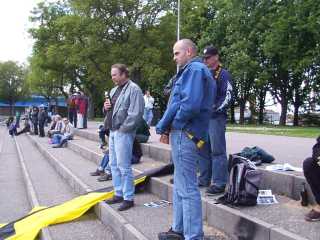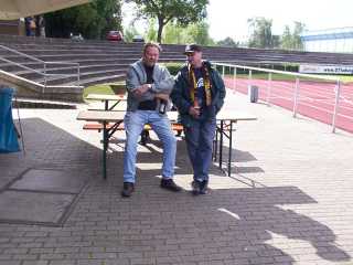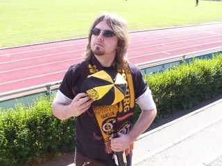Sonntag, 23. Mai 2004. Letzter Zweitligaspieltag, doch wen interessiert das schon wenn es im Ludwig-Jahn-Stadion um den Klassenerhalt geht? Niemand. Um 15 Uhr sollte das Spiel gegen die TSG Hoffenheim beginnen und etwa eine halbe Stunde vor Spielbeginn fand ich mich mit Rucksack und Schwenkstangen bestückt am Stadion ein. Am Eingang traf ich auch gleich auf Jule, der die Tribüne auch schon bestückt hatte und man sprach noch über den Vatertag. Irgendwie waren wir da in einer ähnlichen Verfassung. An der Gegengeraden waren wir dann die Ersten und es wurde erstmal ausgepackt. Jule meinte noch einen Bengalo dabeizuhaben und das dann sicher sehr schön aussähe mit der Überziehfahne und den beiden flankierenden Schwenkfahnen. Da hat er schön bei foros mitgelesen. Ich träumte auch mal wieder von demselben Bild zu dem ich mir noch den Doppelhalter (siehe bei "über mich" das alte Bild aus Pforzheim) im Hintergrund vorstellte. Daraufhin kamen wir auf allerlei lang nicht mehr gesehene Fanutensilien zu sprechen, die nun wahrscheinlich in allerlei unbekannten Kellern vor sich hin gammeln. Traurige Geschichte. Während die Schwenkfahnen fertig gemacht wurden, konnten wir uns auch schon über das heutige Schiedsrichtergespann lustig machen. Ein wohlbeleibter Assi war bereits an der Bande außer Atem und pumpte wie ein Maikäfer. Das konnte ja was werden. Kurz darauf tauchte auch schon ein Frank auf und ich vermißte das erhoffte Stück Stoff. Tatsächlich hatte der die Fahne nicht dabei und auf meine Schelte entgegnete er lapidar, er hätte mit Regen gerechnet und es sei ihm zu beschwerlich das nasse Ding auf dem Balkon zu trocknen. Großartig wenn ich bedenke, daß ich über keinen Balkon verfüge und die LEGION-GELBE-ADLER-Zaunfahne auch immer trocken bekomme. Nach und nach füllte sich das Stadion dann etwas ...