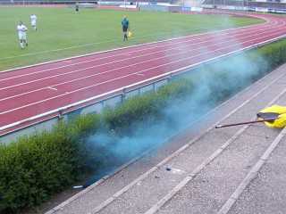... dummerweise fuhr zu der Zeit in Monaco die Formel1 und so kündigte sich ein neuer Minusrekord an. Zwischendurch hatte auch das Vorwort unseres neuen 1. Vorsitzenden im Stadionblatt für Heiterkeit gesorgt. Zitat: "Bringen Sie Freunde und Bekannte mit in unser herrliches Stadion. Wir haben noch Platz." Sehr putzig. Es wurde noch etwas über Absteiger und 4. Plätze gelabert und dann liefen auch schon die Spieler ein. Zu den beiden Schwenkfahnen zündete Jule seinen vermeintlichen Bengalo und die Erheiterung war erheblich wie sich aus dem Röhrle nur etwas blauer Rauch herausquälite. Mit dem Anpfiff begann dann auch natürlich unser Support und die Spieler zeigten, daß sie die drei Punkte gegen den Tabellenletzten heute einfahren wollten. Währenddessen kokelte Jules tolles Teil an der Hecke weiter vor sich hin.