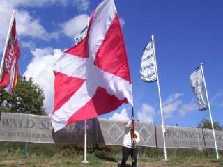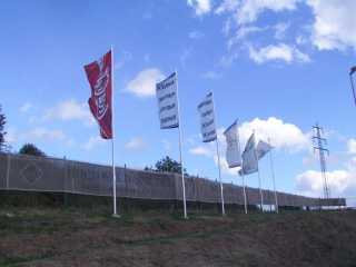 ... nicht zu warm aber trocken. Ideal. Traditionell wurden dann die Fahnen auf der Gegengeraden vor der Bande am Hang mit Heringen befestigt.