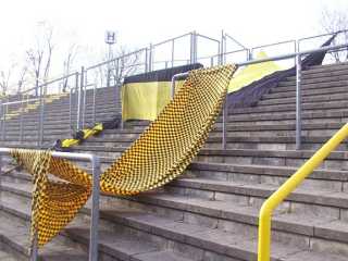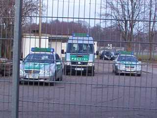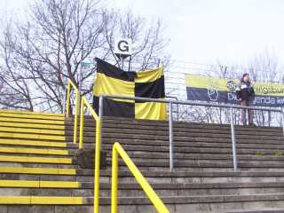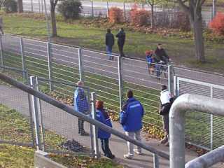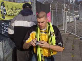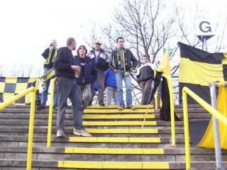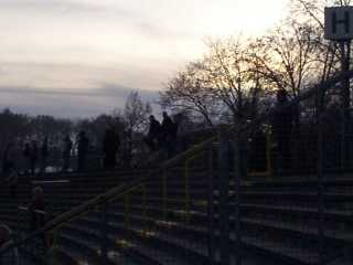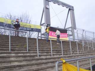 ... und die paar Leute waren zügig eingeteilt. Dann kam mal wieder der Augenblick der Beleidigung. Zur übersteuerten Musik kamen die Mannschaftsaufstellungen und als der Dummkopf von Stadionsprecher uns provozierte kam auch gleich das übliche SPORTVEREINIGUNG, DU ARSCHLOCH!!! Wahrscheinlich ging das aber im Lautsprecherlärm unter. Wenigstens gelang unser Intro ganz gut und ich hoffe, die Bilder vom Frank werden was.