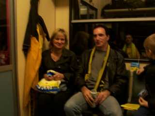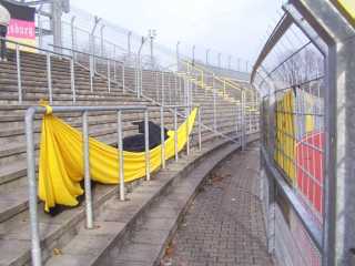 Mit dem Anpfiff legten wir dann traditionell verbal richtig los und ich merkte schnell, daß der Alkohol ganz schön an die Kondition geht. Die Ulmer waren diesmal auch ganz gut drauf, ich verstand aber nicht, warum die Fans so im Stadion verteilt waren. Das Spiel war von uns nicht so optimal und nach 5 Minuten stand es auch schon 1:0 für die Ulmer. Da war aber noch viel Zeit, das wieder auszubügeln und wir machten uns noch keine Sorgen. Irritierend fand ich nur die zwei Trötfeilen rechts von uns mit der ekelhaften Fanfare aber leider wollten auch die Ulmer Ordner sich dieses Pack nicht andrehen lassen. Wenigstens hatten die gastfreundlichen Ulmer wenigstens den Gästeblock mit gelb verziert.